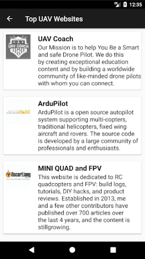Other than the above-mentioned Quality content, this app "Learn About Drones" provides the user with direct links to the most famous and top-rated websites which are based on the field of Drones and UAVs. These links would be highly beneficial to our users as they include tutorials of every branch of UAV, Questions, and answers, Forums for doubt solving and detailed information about various products.