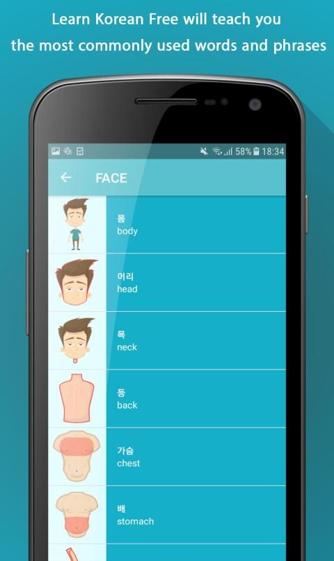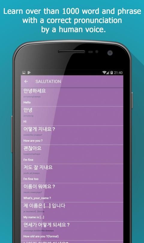 Learn Korean Free will teach you the most commonly used words and phrases you can learn over than 1000 word and phrase with a correct pronunciation by a human voice.
