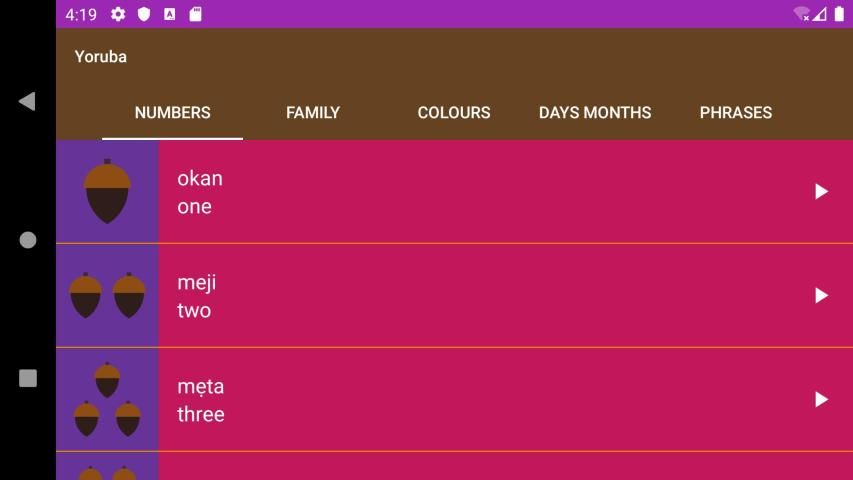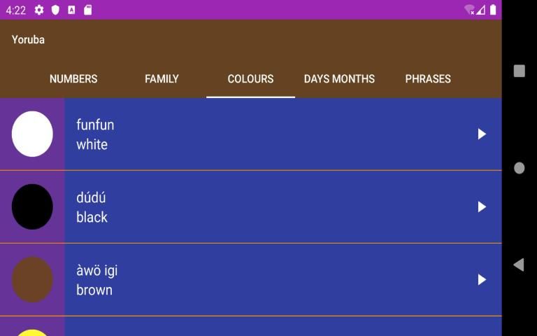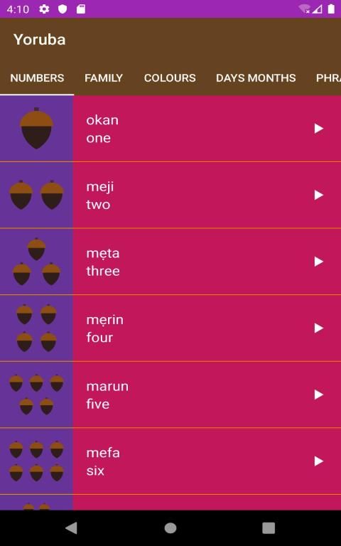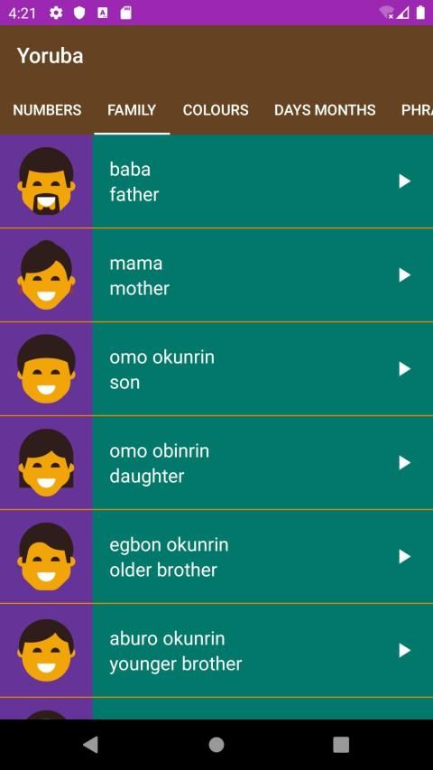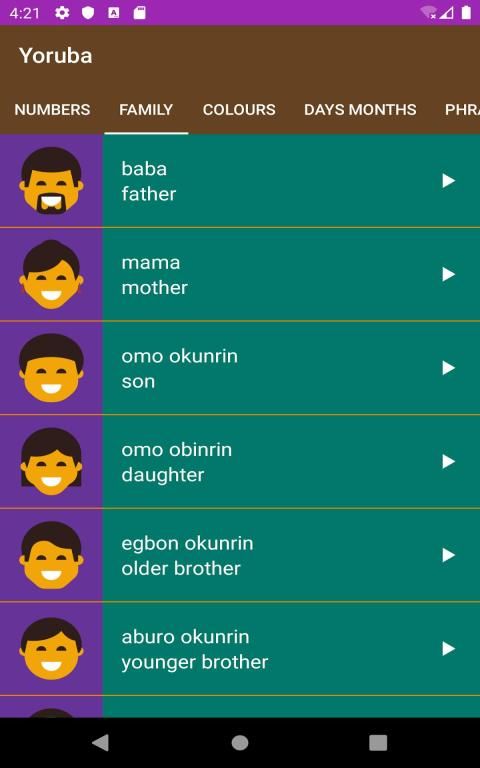 Learn Yoruba in easy steps is educative and fun to learn. It is a descriptive and interactive app with colourful images and audio playback translating English words into Yoruba language. App consists of six different and unique categories for broader and easy learning experience. Numbers, Family, Colours, Days of the week, Months of the year and Phrases words translation into Yoruba are shown below in phone and tablets user interface. User can scroll from left to right access different categories within the app. Learn Yoruba is illustrative with different background colours to make learning Yoruba language fun and captivating for young or older user. The key features of the app are the audio and picture images. The audio recording will enable users to learn the proper pronunciation of each list items.
