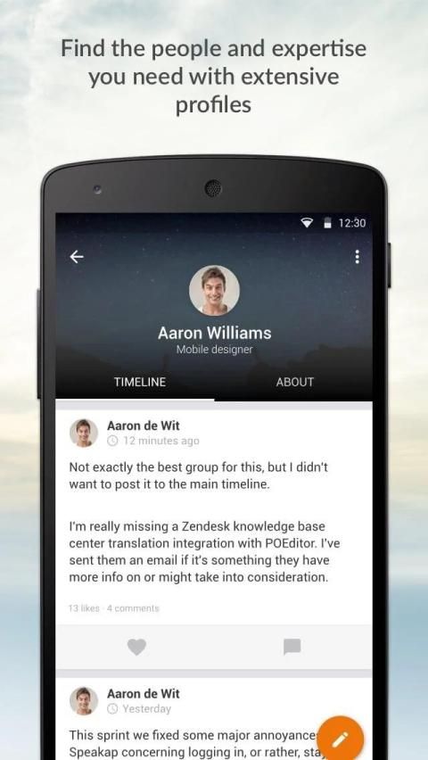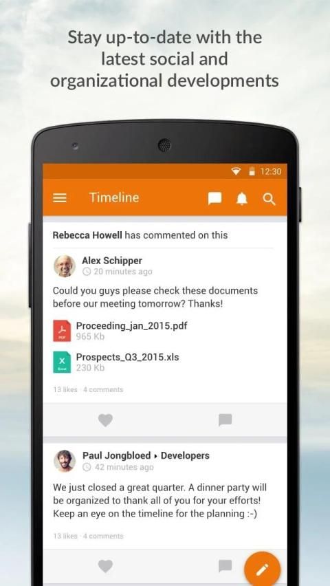अपनी टीम, अपने विभाग या पूरी कंपनी के साथ नए ज्ञान, नए विचारों और आंतरिक सफलताओं को जल्दी और आसानी से साझा करें। चित्रों, वीडियो या इमोटिकॉन्स के साथ संदेशों को समृद्ध करें। अपने सहयोगियों, संगठन या भागीदारों से आसानी से नए पोस्ट ट्रैक करें।