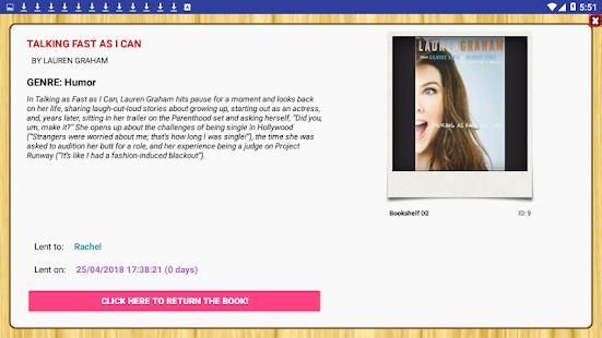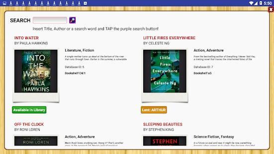आवेदन बच्चों और वयस्कों के एक पेशेवर डेटाबेस, गैलरी / कैमरा से ली गई तस्वीरों से पुस्तकें जोड़ने और रिटर्न के लिए एक समय सीमा निर्धारित करके ऋण प्रबंधित करने की क्षमता के माध्यम से पुस्तकों के संग्रह का प्रबंधन करने की अनुमति देता है।