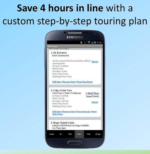 -Customized step-by-step touring plans for both Disneyland and Disney California Adventure. You tell LINES which rides you want to see, and LINES will create a step-by-step itinerary showing when to go to each ride to avoid long lines. You can even change your plans while you’re in the park!