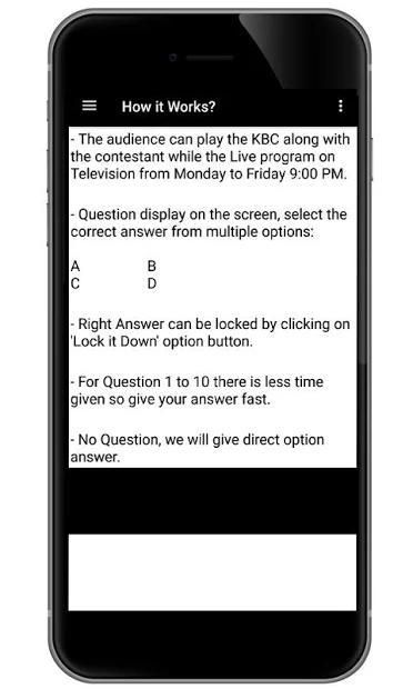 - Very easy to use app for kbc answers you will get correct real and true answers in this app when kbc started. Get correct option in the 10 second.