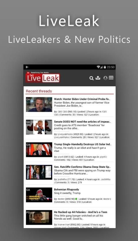 Liveleak एक वीडियो साझा करने वाली वेबसाइट है जो उपयोगकर्ताओं को वीडियो पोस्ट करने और साझा करने देती है, और वह एप्लिकेशन है जो आपको नवीनतम वीडियो ब्लॉग सामग्री के साथ अद्यतित रखता है।