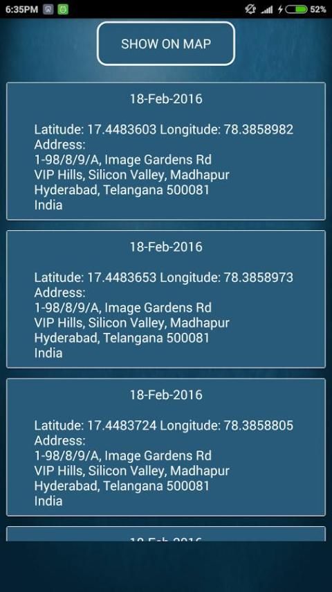 लाइव मोबाइल लोकेशन ट्रैकर मिलेगी तुम्हें पता है, जहां आप दिन के दौरान यात्रा की है और नक्शे पर दिखाया जाएगा मदद करता है। यह आप सभी स्थानों है कि आप नक्शे और सूची दृश्य पर दिन के दौरान यात्रा की है और आपको पता चला है इकट्ठा करने के लिए मदद करता है।