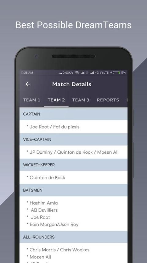 सरल, छोटे और तेजी से अनुप्रयोग Kabbaddi, क्रिकेट और फुटबॉल के लिए सर्वोत्तम संभव dream11 टीमों मिलता है।