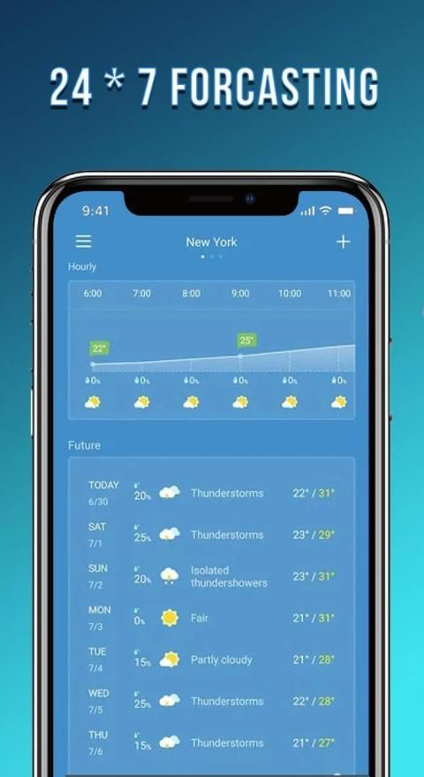कभी-कभी भविष्यवाणी करना मुश्किल होता है। यह सटीक मौसम ऐप दिन के किसी भी समय या अगले 7 दिनों के लिए आइकन पर टैप करके, जहां भी हो, विस्तृत पूर्वानुमान ढूंढने की अनुमति देता है: