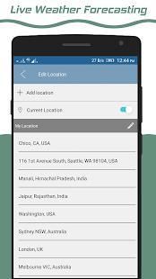 मौसम का पूर्वानुमान अनुप्रयोग एक मौसम चैनल आप कई स्थानों का मौसम का प्रबंधन करते हैं है। होम स्क्रीन पर, उपयोगकर्ताओं को अपने स्थानों में से मौसम देख। तब उन स्थान प्रबंधन के लिए अन्य स्क्रीन पर जा सकते हैं। उपयोगकर्ता लंदन मौसम, पेरिस मौसम, सान फ्रांसिस्को मौसम, ह्यूस्टन मौसम में जोड़ सकते हैं