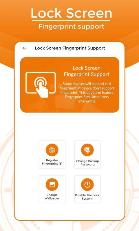 ~ Fingerprint app lock is supported by all phones who has Fingerprint hardware and Marshmallow Android Version and if you don't have one then our Fingerprint Simulator enables simulated App lock support for any phone you have. Enable Simulator from settings and you can simulate fingerprint app lock with PIN or Patten.
