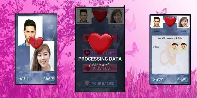 प्यार कैलकुलेटर अनुप्रयोग वास्तव में 4 टेस्ट के कॉम्बो है: प्यार टेस्ट ,, बेबी टेस्ट ,, चुंबन टेस्ट ,, संगतता टेस्ट