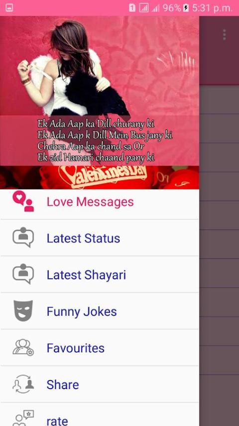 ♥ हम वेलेंटाइन दिवस के अवसर पर अपने प्रियजनों के साथ whatsapp की स्थिति के लिए अपने पसंदीदा प्रेम संदेश साझा करने के लिए एक सरल और सुरुचिपूर्ण तरीका प्रदान करते हैं।