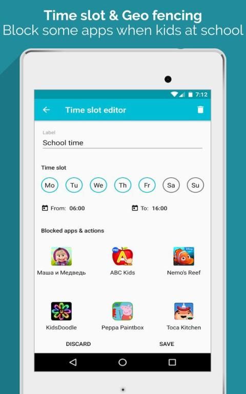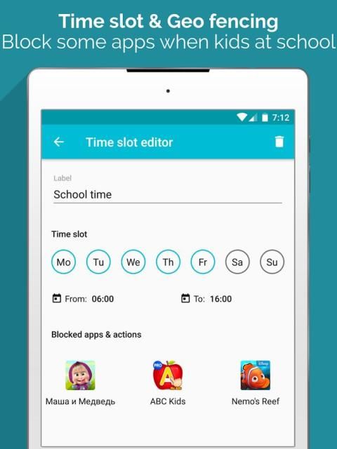 • समय स्लॉट & भू बाड़ लगाने: ब्लॉक चयनित क्षुधा जब अपने बच्चे को स्कूल या परिवार के समय में है