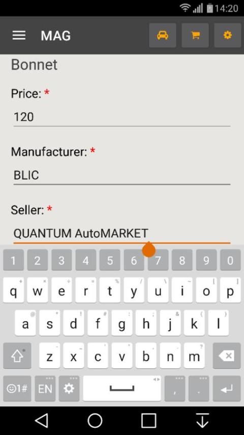 * वाहन हिस्से के चुने हुए नाम के लिए मूल्य, निर्माता का नाम और खरीदार का नाम जोड़ें।