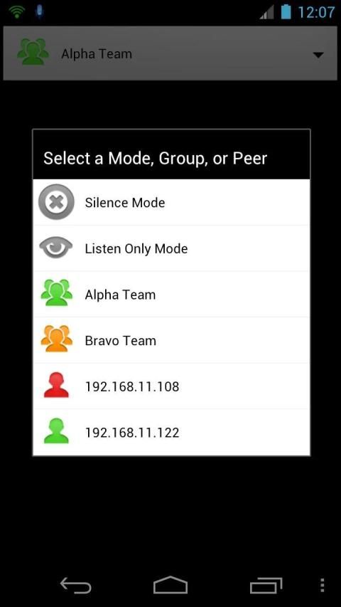 This app will automagically discover other devices in the mesh. Choose a device from the drop-down menu, hold down the mic button, and start talking. You can also create groups of peers and chat with them all at once.