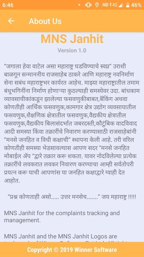 तरीके वरिल कोणतीही समस्या भेडसावलस आपन सदर "मनसे जनहित मोबाईल ॲp (मनसे जनहित - शिकायत / शिकायत प्रबंधन प्रणाली)" द्वारे त्राकर करू शती। यावर नोदविलेल्या प्रत्येक तक्रारींचे लवकरात लवकार निवारण करण्याचा आम्ही सर्वतोपरी प्रयत्न कर करू याची आपनियों या जनहित कक्षाद्वारे गाधी देत आहोत।
