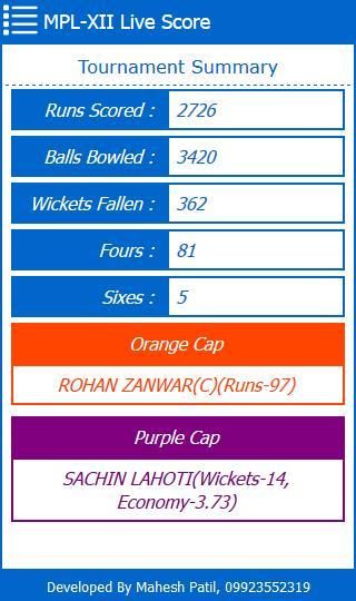 This App Is Developed For Maheshwari Premier League, Sangli To Provide Live Cricket Score For There Local Cricket Tournament. This App Provides Live Cricket Scores, Matches Schedule, Old Match Results, Various Statastics, etc.