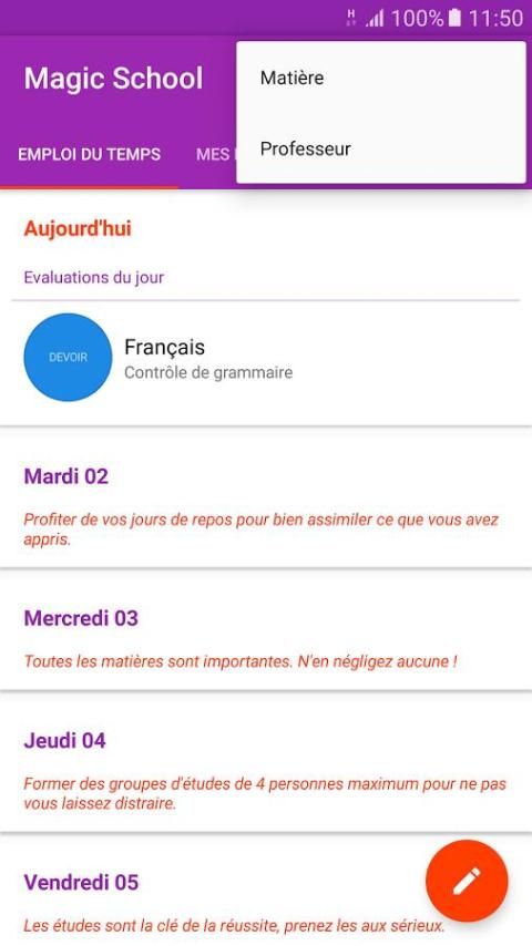 मैजिक स्कूल के विद्यार्थियों और रिकार्ड के लिए उनके कार्यक्रम, उनके शिक्षक, उनकी सामग्री के सभी विवरण आवेदन करने वाले छात्रों के लिए समर्पित है; उनके मूल्यांकन रिकॉर्ड करने के लिए; स्वचालित रूप से स्कूल के घंटों के दौरान चुप मोड के लिए उनके फोन स्विच और बाद मोड बज पर लौटने के लिए; और अंत में उनकी जागरण फोन को बदलने।