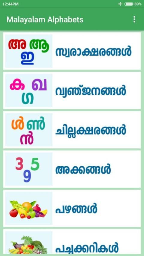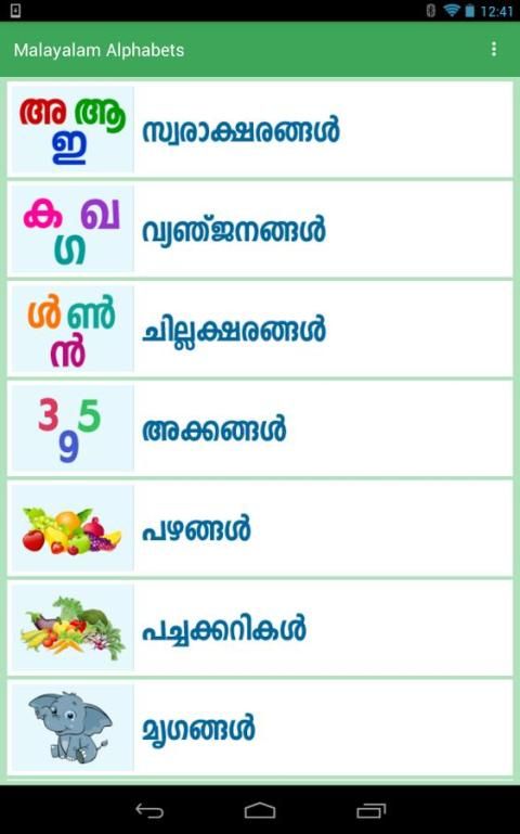 - स्वर, Consenants और Chillaksharam का मलयालम में एक मिल प्रारूप में इस ऐप्लिकेशन में इतना है कि अपने बच्चे को पत्र के बिंदीदार रेखा पर आकर्षित कर सकते हैं शामिल किया गया है।
