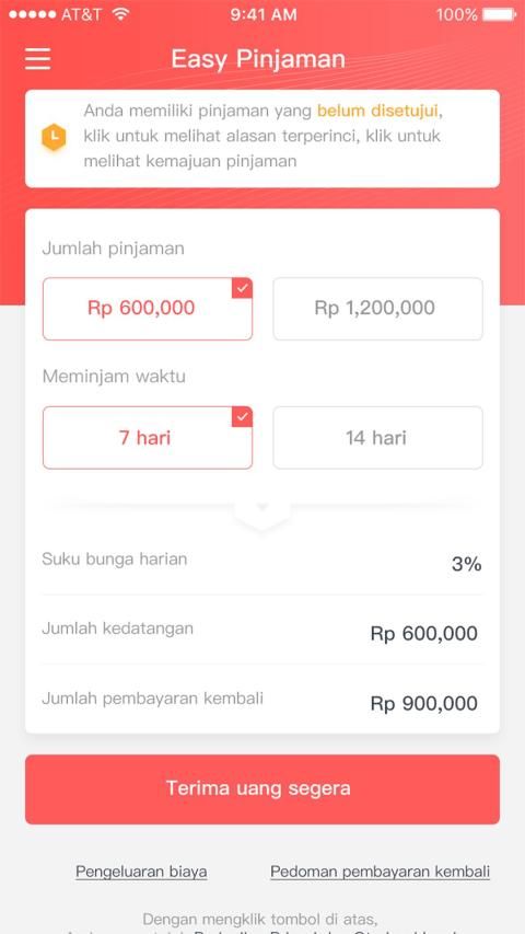 Contoh: Jika Anda memilih batas pinjaman RP1.000.000 untuk jangka waktu 100 hari, bunga yang harus dibayar adalah: 1.000.000 * 24%= RP.240,000