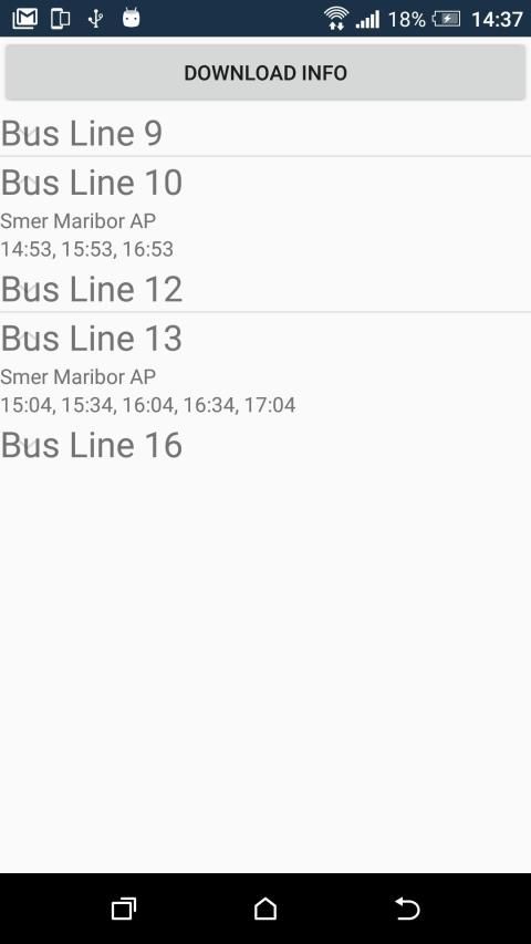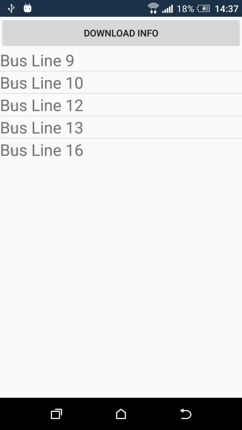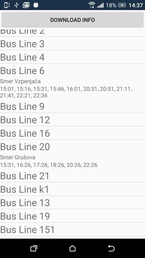 Search for the bus stop and download next 5 times at which bus will arrive. Store this information locally for offline use. Tap and hold on bus stop in the list to add it to favourite. Favourite bus stops will be shown when the bus stop search field is empty.