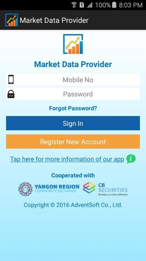 AdventSoft इस मोबाइल आवेदन के लिए यांगून क्षेत्र कमोडिटी एक्सचेंज और सीबी सिक्योरिटीज के साथ सहयोग किया है और परिचालन सेवाओं बा Yint Naung कमोडिटी एक्सचेंज सेंटर में AdventSoft कर्मचारियों द्वारा प्रदान की जाती हैं। यदि आप अधिक जानकारी की जरूरत है, कृपया http://www.advent-soft.com/Product.htm#product-mdp-m पर AdventSoft उत्पाद पृष्ठ पर जाएँ या +959458046103 या +959262302110 या contactus@advent-soft.com पर संपर्क ।