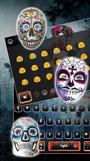 यह कीबोर्ड काली पृष्ठभूमि के साथ खोपड़ी थीम है।