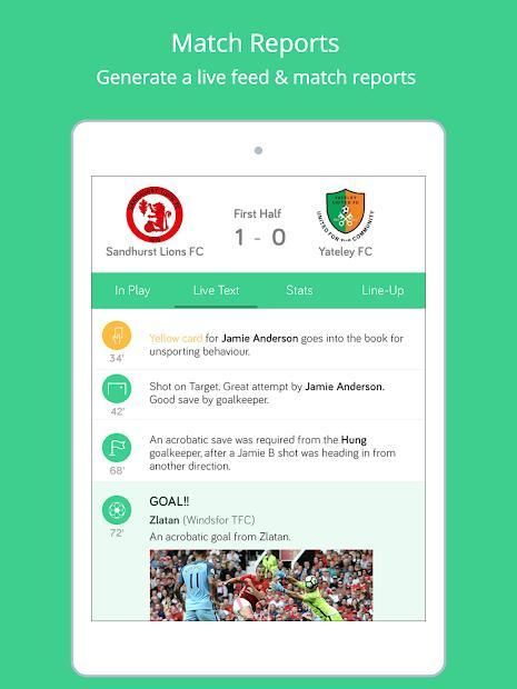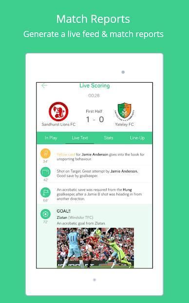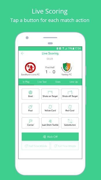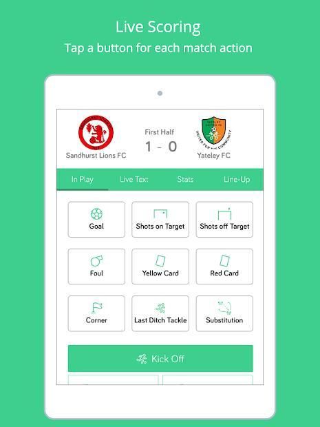 - LIVE SCORING: Tap buttons to create minute by minute text commentary of in game action such as goals, corners, shots, tackles, fouls etc.