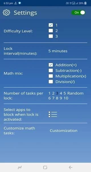Select which apps to lock. Choose lock interval from 1-60 minutes and choose one or several difficulty levels and math equations. You can also customise the math tasks to better suit your children.
