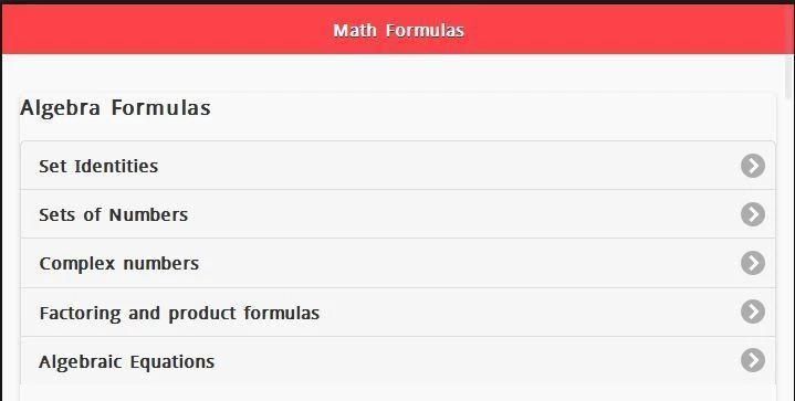 इस गणित फॉर्मूला ऐप इन अध्यायों में शामिल हैं: