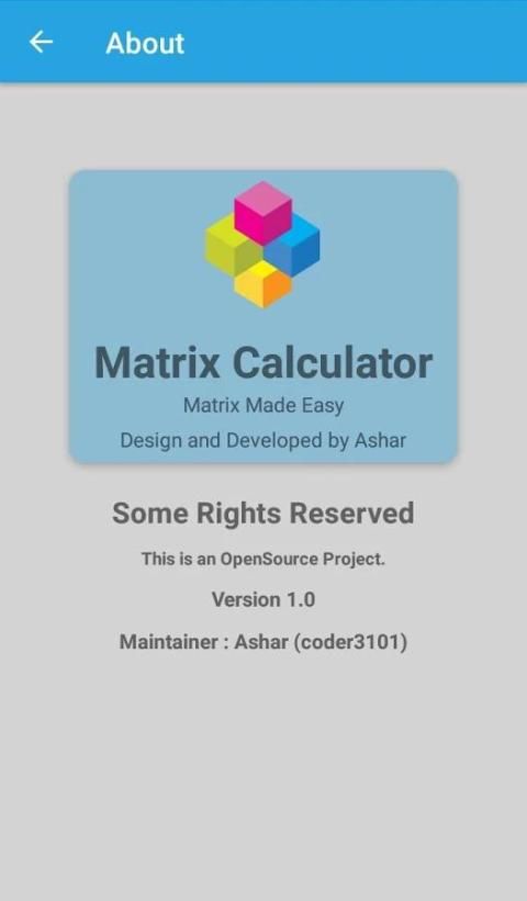 एक खुला स्रोत परियोजना, उच्चतम संभव संख्या दोनों मात्रा में (999999 तक) और परिशुद्धता के लिए की "द मैट्रिक्स मेड ईज़ी", एक सरल और eyecatching यूजर इंटरफेस, कस्टमाइज़ेशन के टन के साथ नारा और समर्थन के साथ (6 दशमलव स्थान तक)। कैलक्यूलेटर 1x1 से 9x9 मैट्रिक्स के लिए किसी भी चर कर सकते हैं।