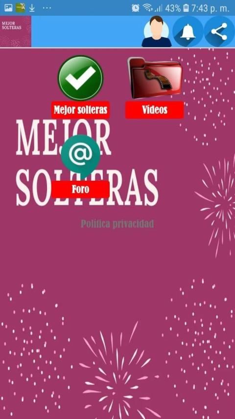 Usuarios de todo el mundo tienen su espacio y se conectan a nuestra aplicación de Mejor solteras para conocer gente, hacer nuevas amistades, tener contactos y chatear sobre diversos temas de la vida cotidiana, en mejor solteras cuentas con la posibilidad de que cada usuario pueda crear su perfil, dar me gusta a las fotos, subir fotos a la galería y chatear sin parar con las demás personas de nuestra comunidad mediante nuestras salas de chat.