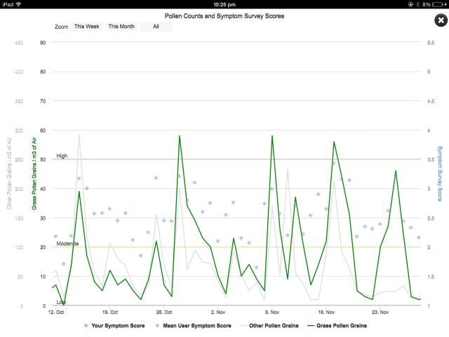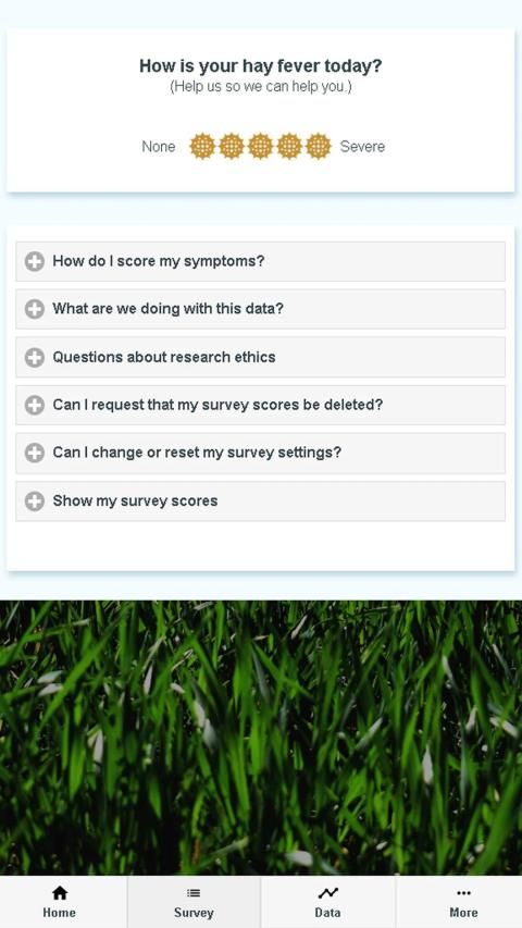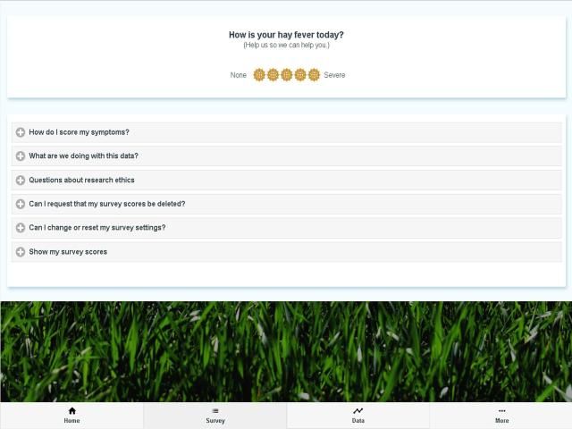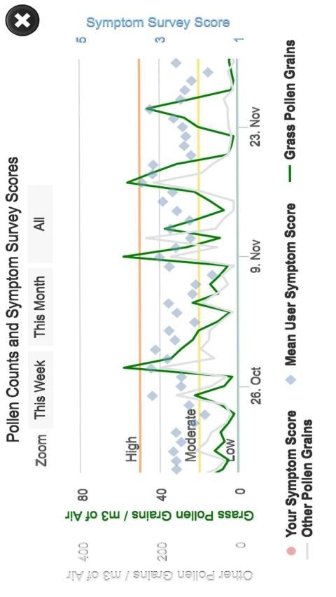 हमारे उपयोगकर्ता हमें यह बताकर हमारे शोध के साथ हमारी सहायता कर सकते हैं कि वे हमारे घास के बुखार के लक्षण सर्वेक्षण के माध्यम से कैसा महसूस कर रहे हैं। सर्वेक्षण द्वारा एकत्र की गई जानकारी हमें पराग गिनती के बीच संबंधों को समझने में मदद करती है और कैसे पराग समुदाय को प्रभावित कर रहा है।