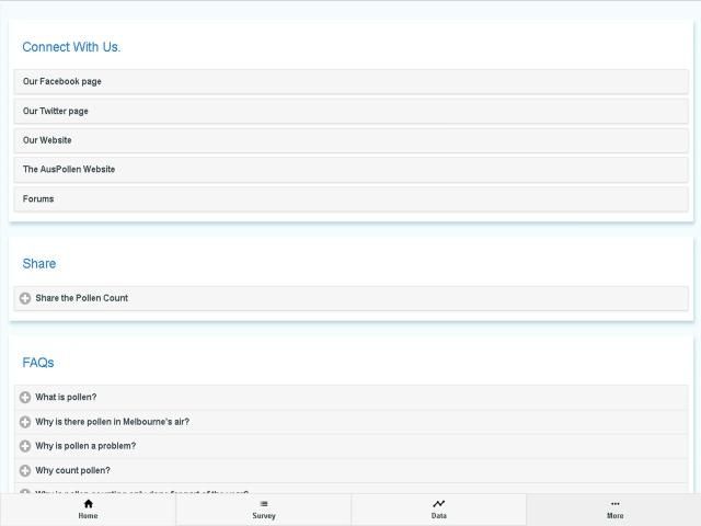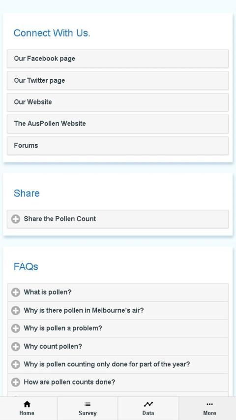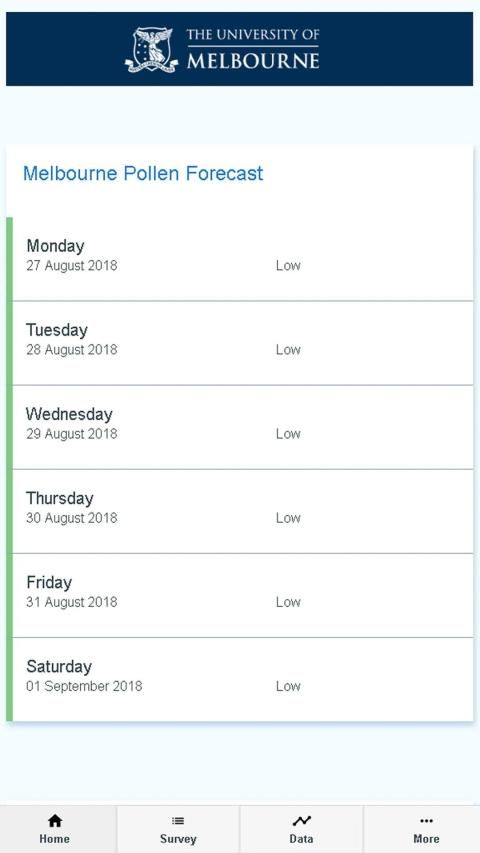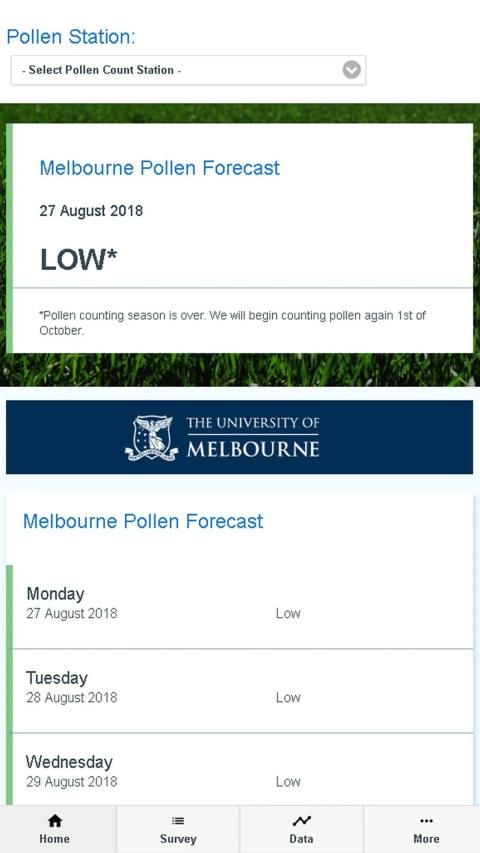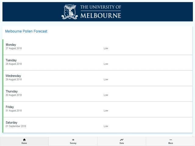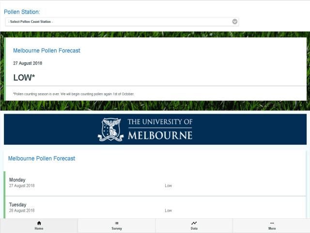 The Melbourne Pollen Count App provides real-world pollen count data during the Melbourne grass pollen season (October 1 to March 31) from 6 pollen counting stations from around Victoria that are run by the School of BioSciences at the University of Melbourne, Australia.