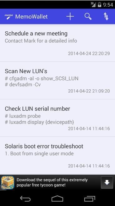 MemoWallet एक सरल, त्वरित, और प्रयोग करने में आसान Memopad (नोटपैड) अनुप्रयोग है.