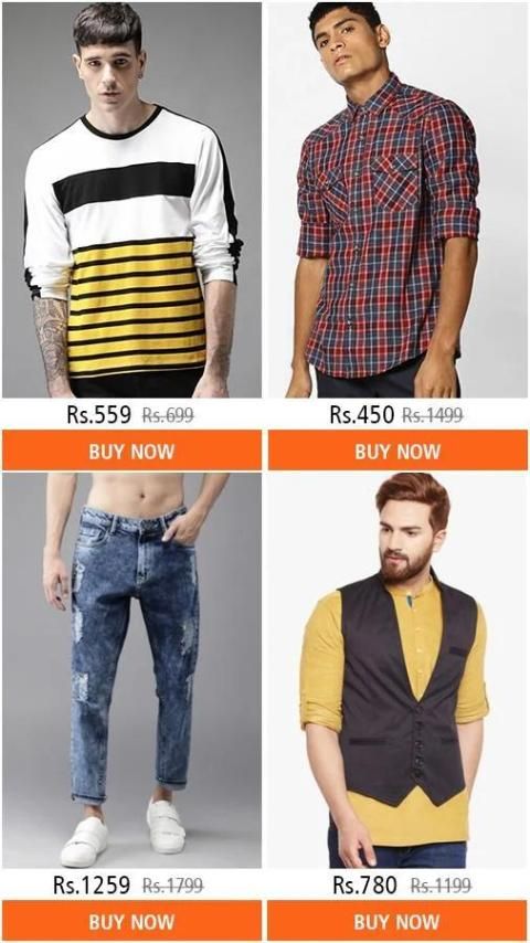 Explore more than 70K+ men clothing products collection in different fabrics, prints, fitting, style, colors and patterns from online shopping websites like Flipkart.com, Myntra.com, Amazon.in, Jabong.com, Ajio.com, ShopClues.com, Voonik.com, nnnow.com, and many more.