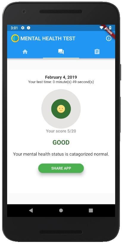 The Mental Health Test is app that help you to know your mental health status. This test is adapted from Self Reporting Questionnaire (SRQ-20). The cut-off value of the test is 6/7 (if your have score same or below 6, you are categorized normal). The cut-off value may be different according to certain area, language, culture, or country.