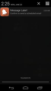 -As Message Later uses the Gmail account that has been used to sign into google play from the phone, therefore a gmail dialogue would be shown which would be including all the details that you filled while scheduling the email. you just have to press send and email is sent.