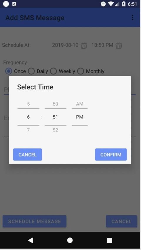 संदेश शेड्यूलर एप्लिकेशन का उपयोग एसएमएस, ईमेल, ट्विटर और व्हाट्सएप संदेशों को शेड्यूल करने के लिए किया जा सकता है। जब भी संदेश देने की आवश्यकता हो, सभी विवरण मोबाइल डिवाइस में संग्रहीत किए जाते हैं और पुनर्प्राप्त किए जाते हैं। कुछ संदेश ई-ट्वीट या व्हाट्सएप संदेशों को प्राप्तकर्ताओं को भेजे जाने से पहले अनुमोदन की आवश्यकता होती है और इसलिए वे संबंधित एप्लिकेशन (ट्विटर या व्हाट्सएप) में खुलते हैं। संदेशों को पुनरावृत्ति वितरण के लिए निर्धारित किया जा सकता है।