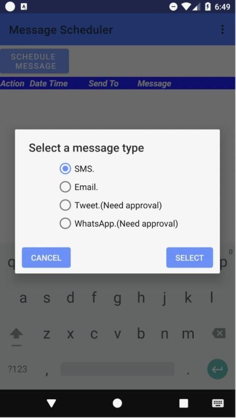 Message Scheduler application can be used to schedule sms, emails, Twitter and whatsapp messages. All the details are stored in mobile device and retrieved whenever the message needs to be delivered. Certain messages e.g tweets or whatsApp messages needs approval before they can be sent to recipients and hence open in the corresponding application ( twitter or whatsapp ). The messages can be scheduled for recurrence delivery.