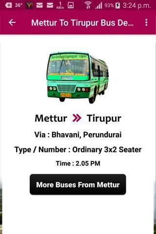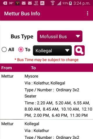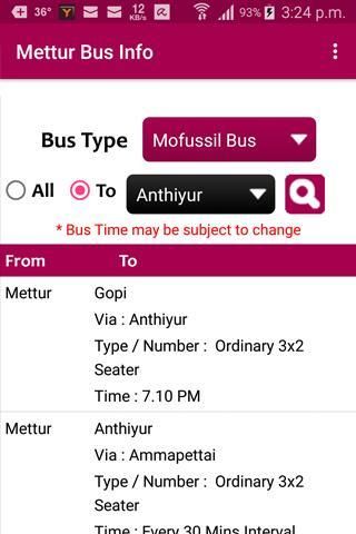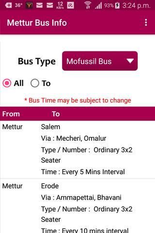 This app provide all information about Mettur Mofussil bus and Town bus.