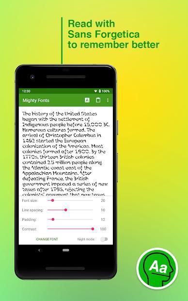 यह ऐप आपको 2 फोंट की मदद से पढ़ने और पढ़ने की अनुमति देता है। सैन्स फोर्जेटिका और ओपन डिस्लेक्सिक। बस पाठ का चयन करें और संदर्भ मेनू से "ताकतवर फ़ॉन्ट्स" का चयन करें। आप सीधे अपने क्लिपबोर्ड से ऐप में सामान पेस्ट भी कर सकते हैं।