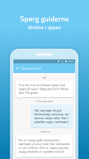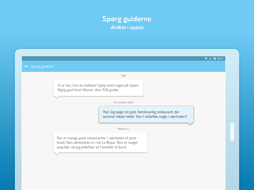घड़ी के चारों ओर TUI गाइड के साथ संपर्क करें आप ऐप में गाइड पूछें के माध्यम से एक संदेश भेजते हैं और कुछ ही समय बाद एक प्रतिक्रिया प्राप्त करते हैं। आप नियोजन चरण के दौरान ऐप के माध्यम से गाइड तक भी पहुंच सकते हैं - यात्रा बुक करने के बाद पहले से ही दिन। ऐप में, आप यात्रा के दौरान सेवा संदेश और अन्य महत्वपूर्ण जानकारी भी करते हैं।