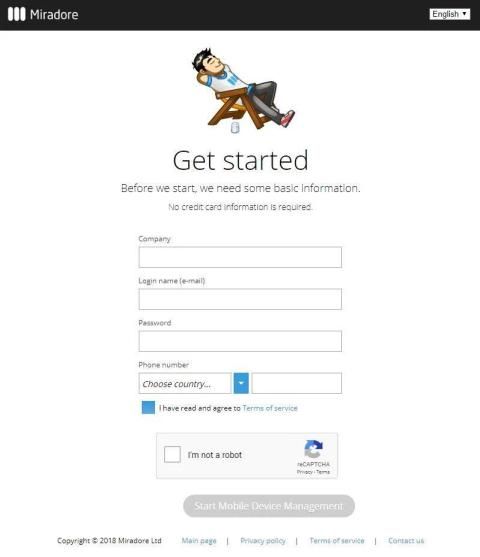 - Click “Get started” at www.miradore.com to register in the MDM service.