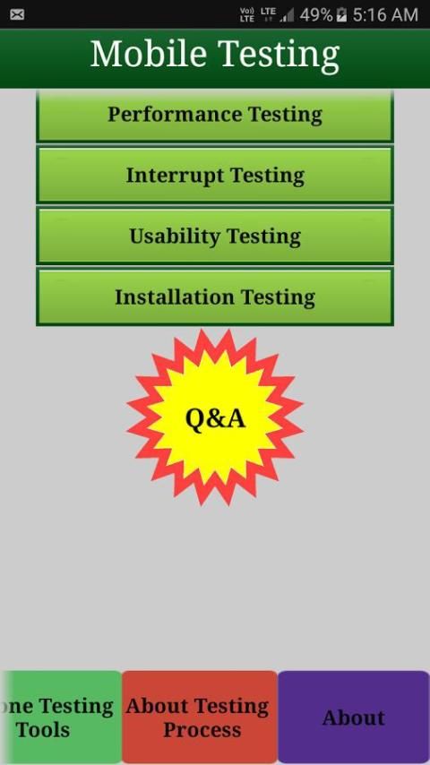 यह एप्लीकेशन मोबाइल टेस्टिंग सुझाव पर प्रदान की. यह यूआई, कार्यात्मक, प्रदर्शन, बाधा, स्थापना और प्रयोज्य परीक्षण की तरह अनुप्रयोग परीक्षण की बुनियादी शिक्षा के होते हैं.