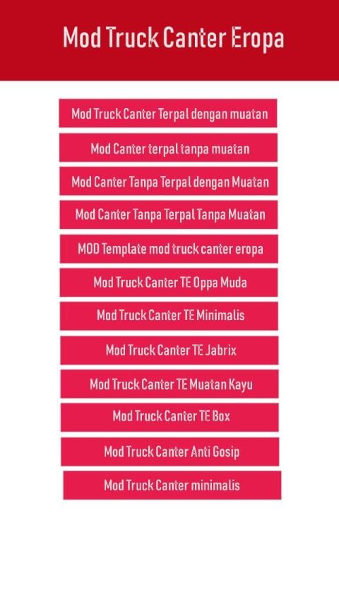 Mod truck canter sangat populer dan mempunyai banyak variasi terbaru untuk mod truck canter 2019, yang diantaranya yang populer adalah mod truck canter actross bussid atau mod truck canter eropa. Selain itu terdapat banyak variasi untuk mod truck canter bussid seperti mod canter tribal, mod canter konvoi , mod bussid hino. Terdapat beberapa list untuk aplikasi mod truck canter bussid :