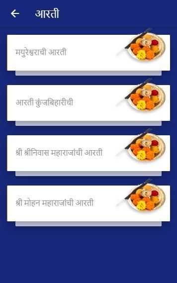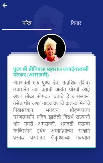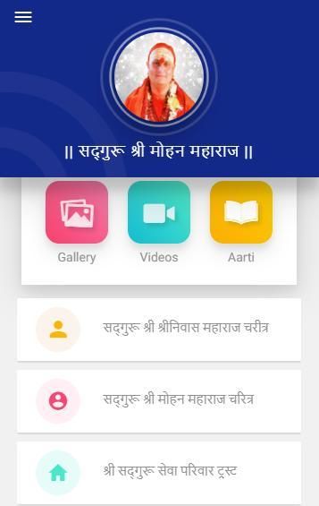This app has Dashboard which has slider containing images. Sadhguru Shri Mohan Maharaj Bhagwat Katha, Images, Aarti. About 'Mohan Maharaj' and his Guru 'Shri Shrinivas Maharaj'