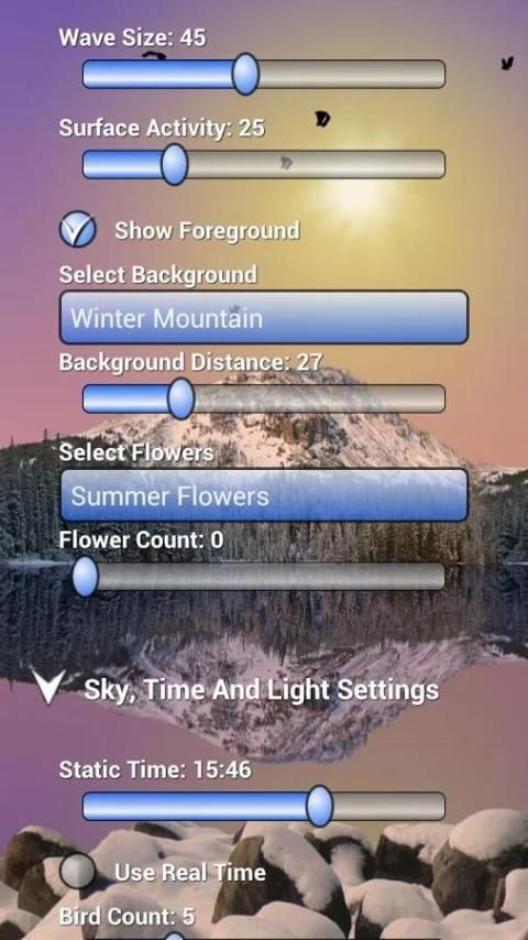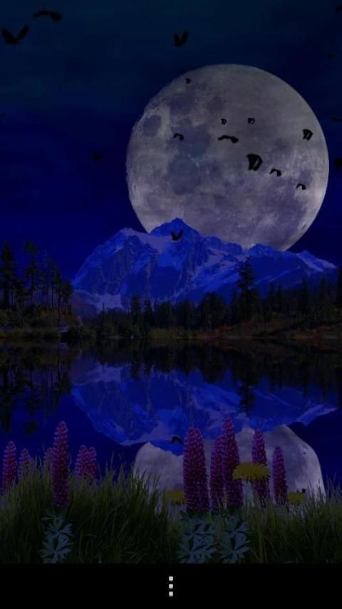 झील के शांत आराम लहरों में दर्शाती लुभावनी पहाड़ों. अग्रभूमि में फूल और घास, बादल, सूरज और चंद्रमा के समय पर निर्भर करता है के साथ हवा और एक जीवित आकाश में पक्षियों. सभी उपकरणों पर क्षैतिज स्क्रॉल समर्थन करता है.
