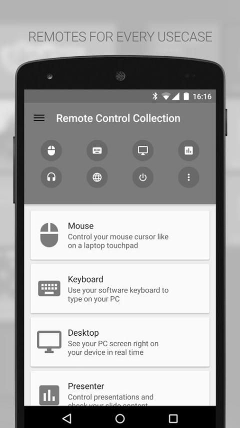 Imagine your PC’s touchpad right on your Android device. Multitouch gestures like scrolling and zooming are supported. You can toggle the keyboard to send keys at the same time.