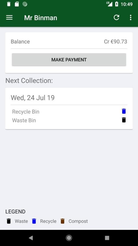 The Mr Binman app allows Mr Binman customers to view upcoming bin collections, view collection and payment history, get notified about upcoming collections and make payments to their account.