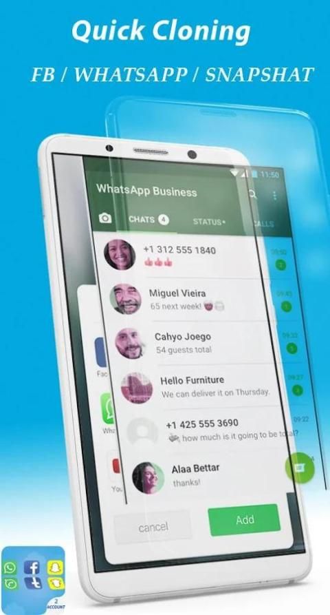 कई जगह व्हाट्सएप और फेसबुक या अन्य सामाजिक और गेम खातों के लिए असीमित बहु समानांतर एप अकाउंट क्लोन में मदद करता है और एक फोन पर काम और जीवन को अलग करने के लिए ऑनलाइन एक साथ रखता है
